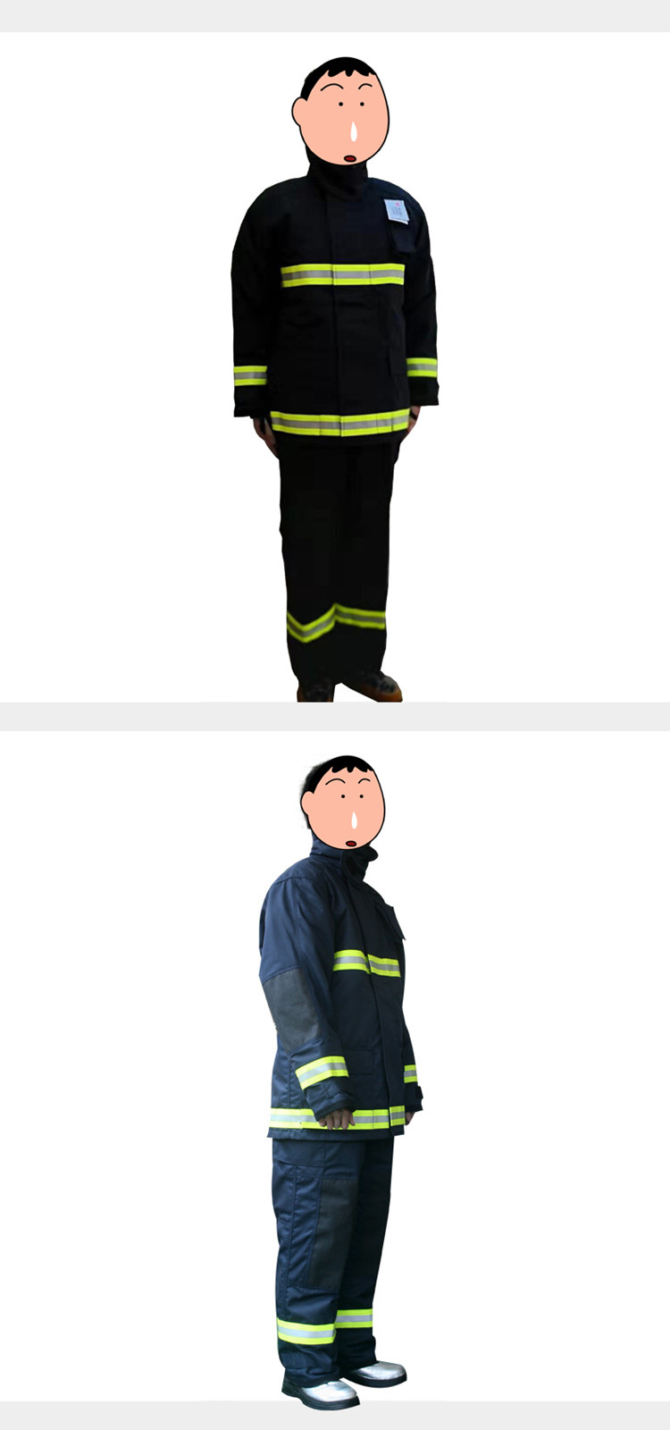 flame retardant layer,water proof layer, heat insulation layer, and comfortable layer, reflective tape on the upper and lower of garments clearly.